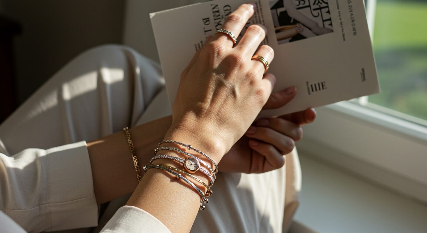 ブレスレットの重ね付けは、手元に華やかさとこなれた印象を与える効果的なスタイリング方法です。