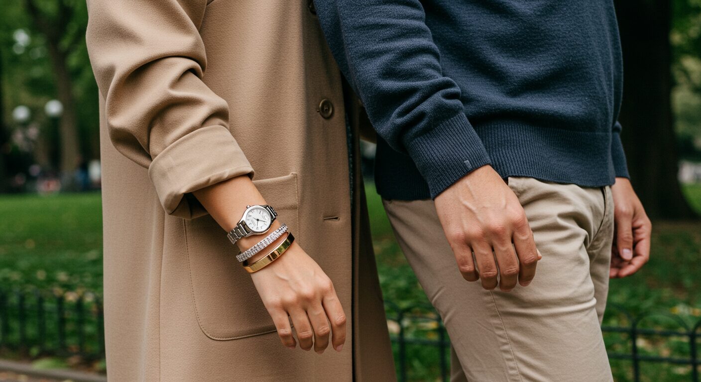 このように、時計とブレスレットのバランスを工夫することで、手元に自然なアクセントを加え、洗練された印象を演出することができます。